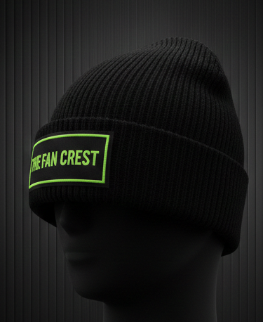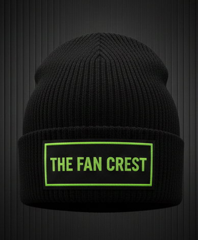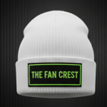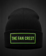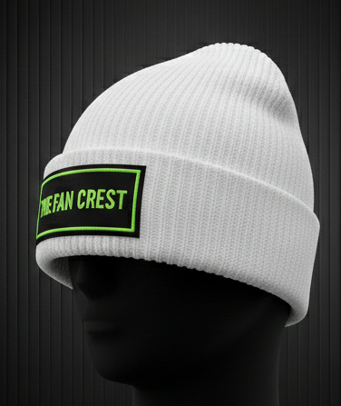 The hat features a clean, optic-white ribbed knit construction that provides a snug, comfortable fit for all head sizes. The centerpiece is a high-contrast black woven patch prominently featuring “The Fan Crest” typography in our signature lime-green “Electric Glow” finish. With its reinforced fold-over cuff, this beanie offers double-layered warmth where it matters most, making it the perfect companion for those freezing night matches or early morning runs.